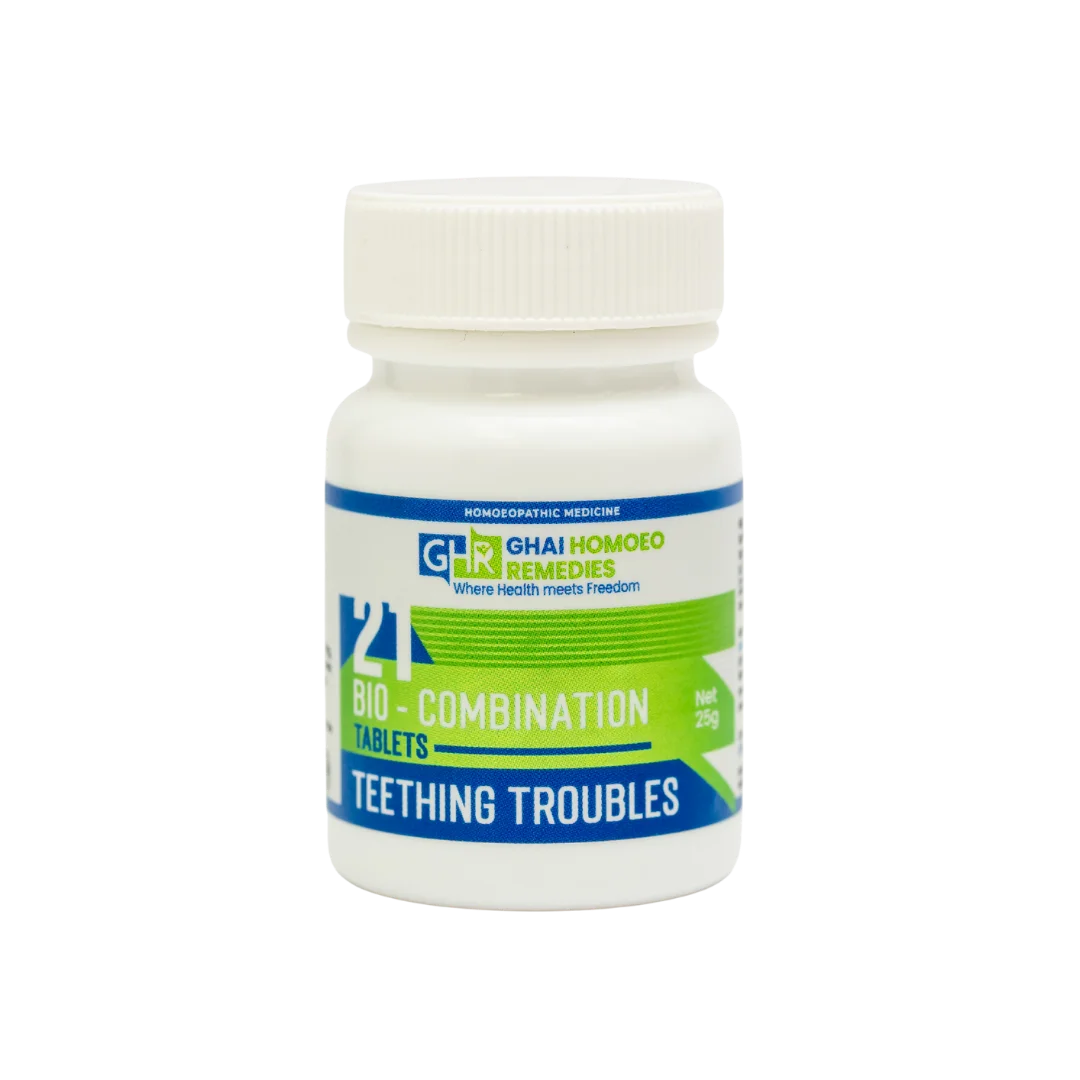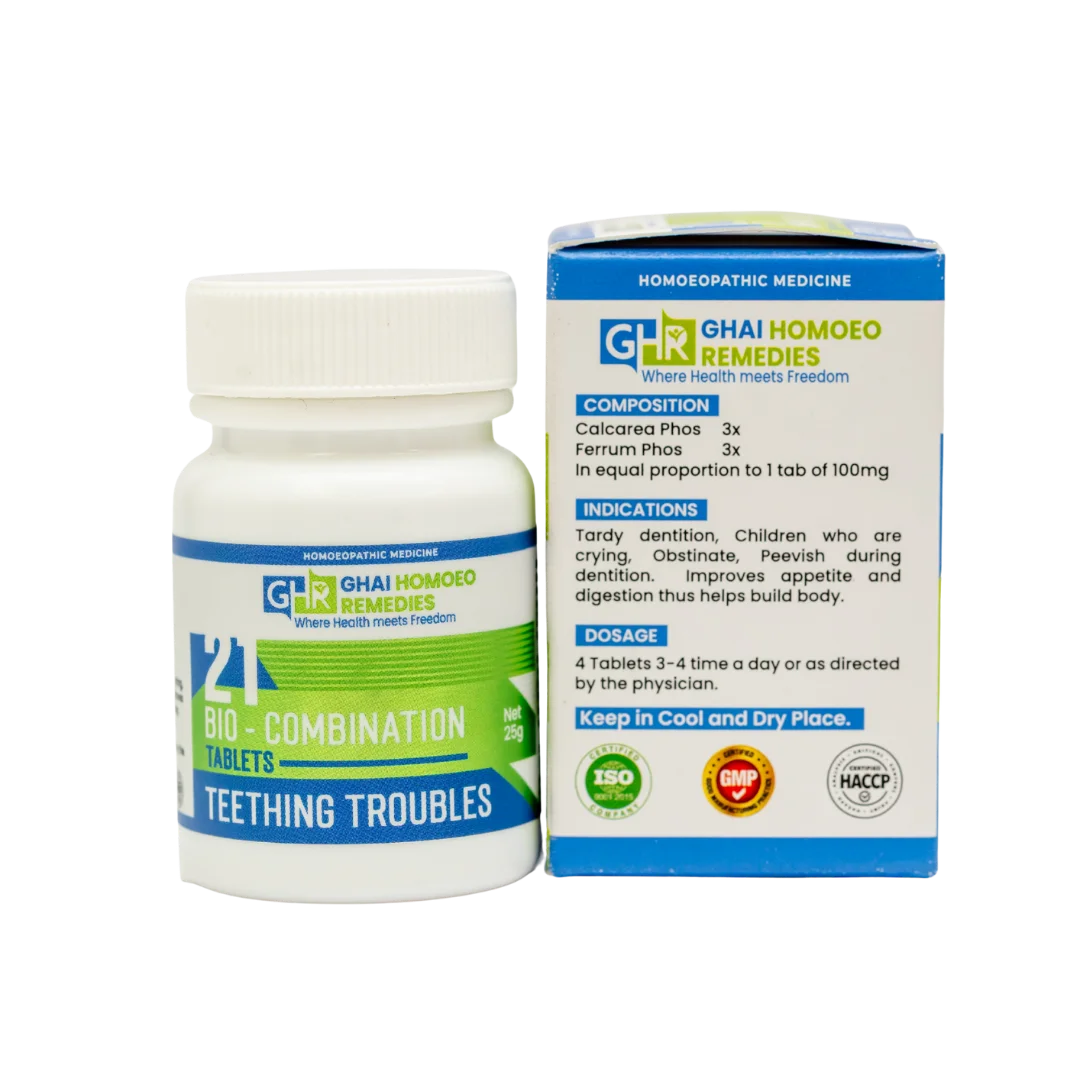 GHR Bio Combination 21 is a trusted homoeopathic remedy specially formulated to support healthy dental development and soothe teething discomfort. It promotes the body’s absorption of essential calcium and phosphates, which are vital for strong teeth and bones, while calming common teething troubles.