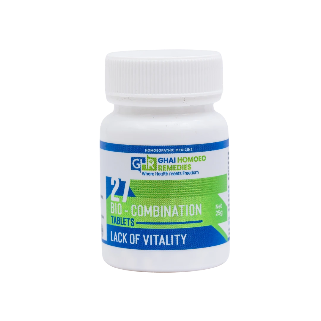 GHR Bio Combination 27 restores vitality and combats general debility. This homeopathic remedy, similar to SBL's Bio-Combination No. 27, balances electrolytes to enhance stamina and nerve function. It supports recovery from exhaustion and weakness.