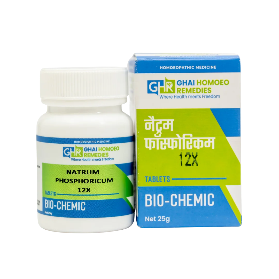 GHR Natrum Phosphoricum features Sodium Phosphate in 12X potency, a vital biochemic salt that alkalizes acidic conditions in the body. It targets metabolic disturbances from lactic acid buildup.