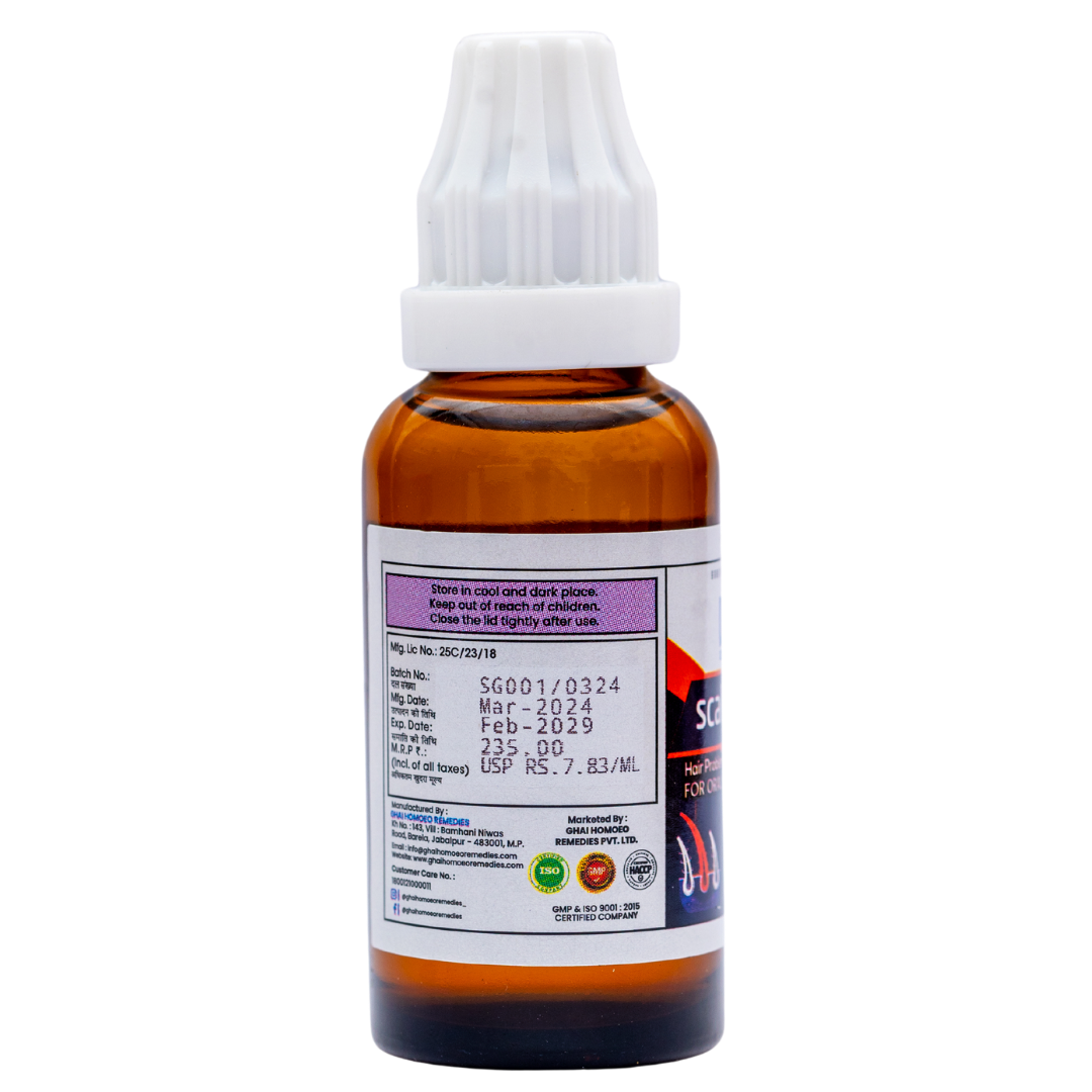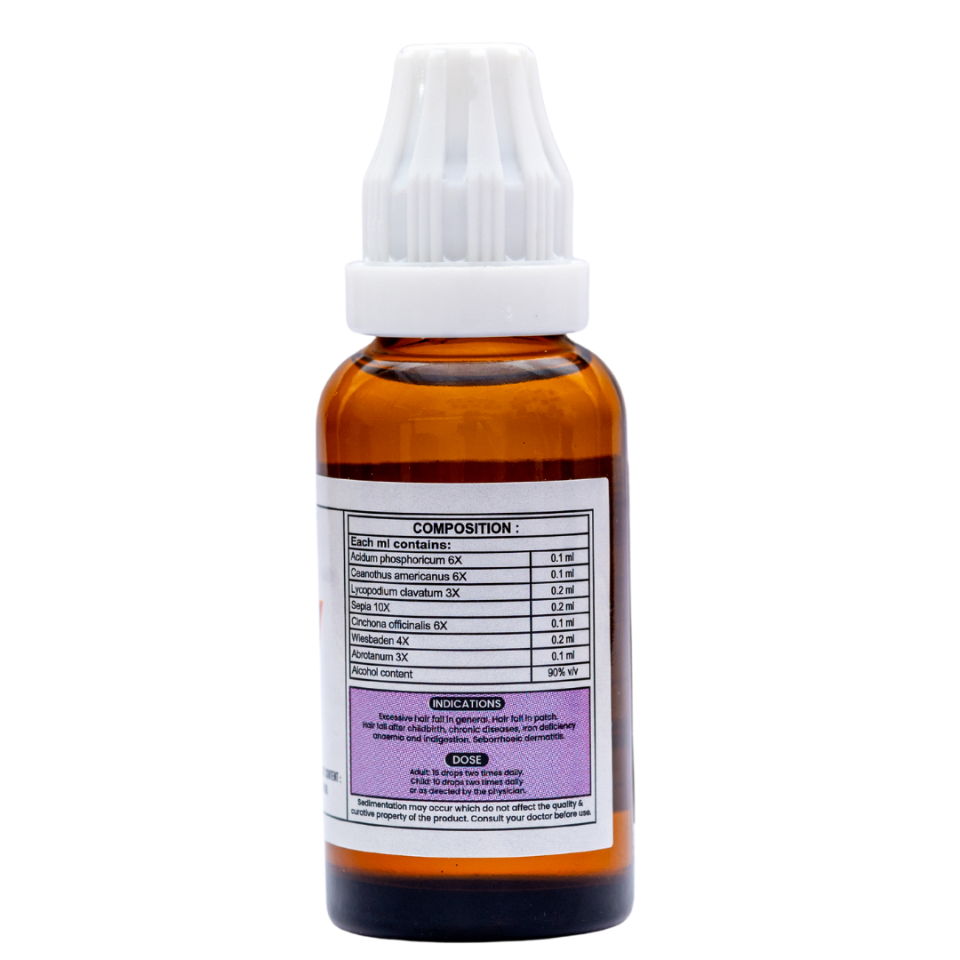 Action: Excessive hair fall in general. Hair fall in patch. Hair fall after childbirth, chronic diseases, iron deficiency anaemia and indigestion. Dandruff. Seborrhic dermatitis of the scalp.